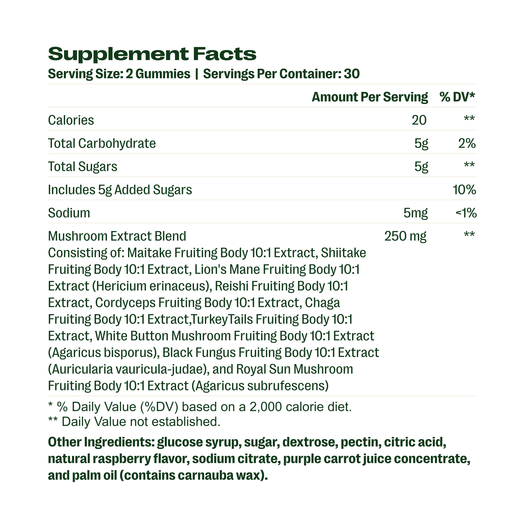 Our raspberry gummies offer a comprehensive blend of 10 of the world's most nutrient-dense mushroom species.